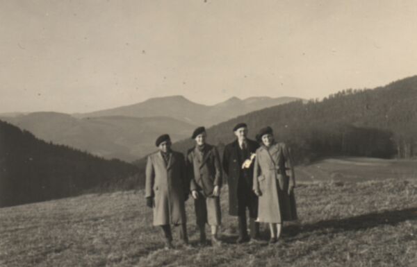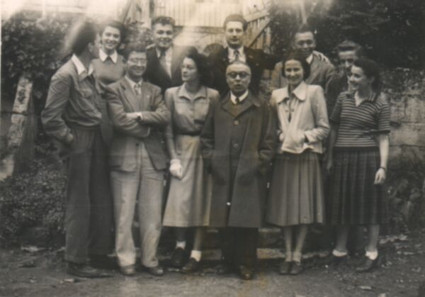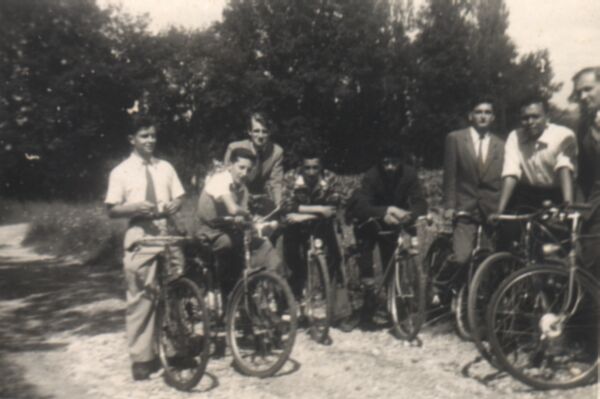 Dans la région de Sainte-Foy, promenade à vélo, le lundi de Pentecôte 29 mai 1950. De droite à gauche : Weber, Andriamasy, Nissol, Soulier, Reysenberg, Privault, Couve, Monnier.