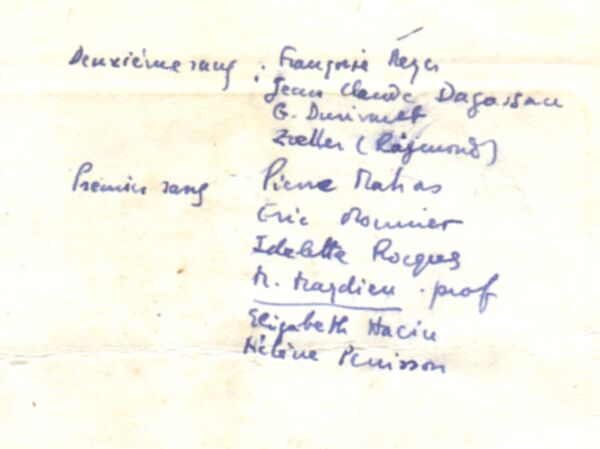La première photo qu'il envoie du Collège de Guyenne à Sainte-Foy-la-Grande (Gironde), le dimanche 30 octobre 1948. Il y reste deux ans, pour passer son bac, tout en étant surveillant d'internat. C'est un Collège privé protestant (où nous sommes revenus en 1961, avec Annick et Michèle, en congé familial) où il s'est fait beaucoup d'amis fidèles parmi les Profs, mais surtout parmi les jeunes du groupe dont il était responsable. Nous sommes allés, à chacun de nos séjours en France, chez les parents de Claude Fritz (le parrain d'Annick) à Strasbourg ; chez les parents de Daniel Cabé-Maury (le parrain de Michèle) au Mans ; et chez les parents d'Yves Soulier (le parrain d'Alain) à la Frette-Montigny.